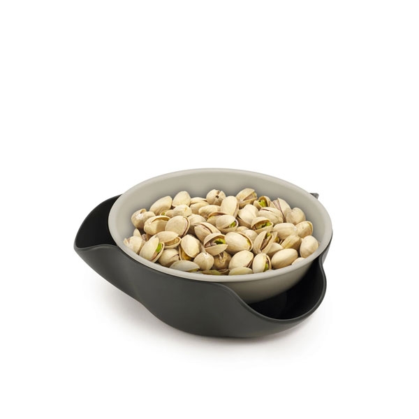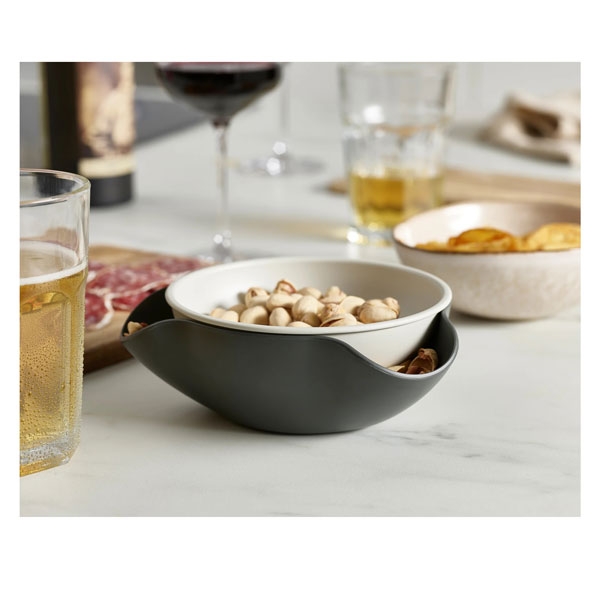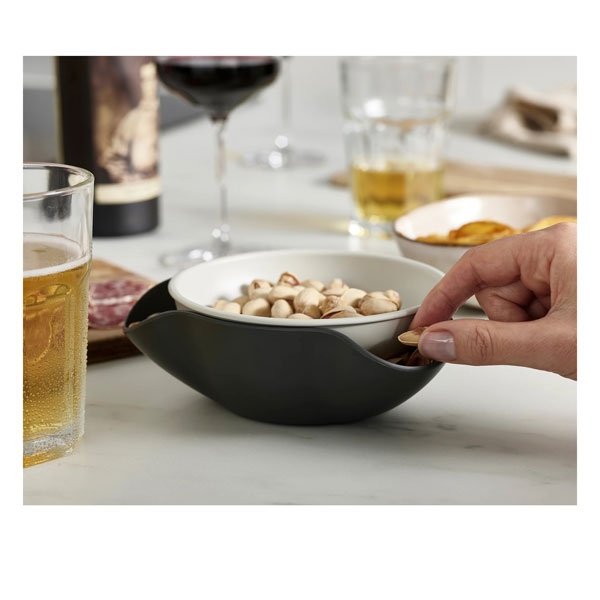 Dodatni opis: Double Dish činija za grickalice je savršeno rešenje za posluživanje hrane kao što su masline pistaći i sve druge sitne namirnice sa nejestivim delovima. Njegov jedinstveni dizajn se sastoji od posude za posluživanje na gornjem delu naslonjene na veću činiju za prikupljanje ostataka. Činija je napravljena tako da ima 3 zakrivljena dela u obimu koja omogućavaju da se ljuske i koštice odlože i sakriju unutar nje. Zbog ove mogućnosti potreba za dodadnim tanjirićem ili činijom za otpad je eliminisana. Double Dish činija za grickalice je napravljena od melamina. Double Dish se može u razdvojenom stanju koristiti i kao 2 zasebne činije za posluživanje drugih grickalica. Double Dish činija za grickalice se može prati u mašini za sudove. Ova činija dolazi u nijansama sive boje.