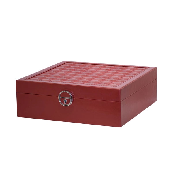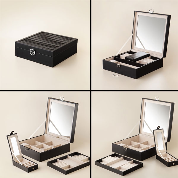 Kutija za nakit sa prenosnim delom odnosno manjom kutijom u sebi koja se može izvaditi i koristiti kao zasebna kutija. Posebno je praktična za putovanja. Velika kutija se zatvara tj. otvara uz pomoć kopče u srebrnoj boji a manja uz pomoć drikera srebrne boje koji je na kratkom kaišiću. Sa donje strane poklopca velike kutije celom površinom se prostire ogledalo. Dno kutije je rezervisano za krupniji nakit i satove a poklapa ga okvir sa malom putnom kutijom i mnoštvom pregrada za sitan nakit. Putna kutija takođe ima malo ogledalo ispod poklopca. Unutrašnjost obeju kutija obložena je mekim materijalom svetle boje koji sprečava oštećenja nakita.