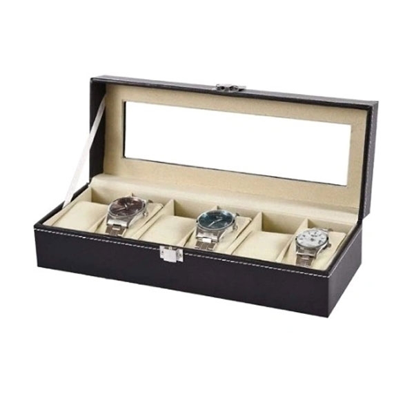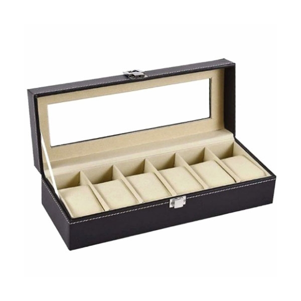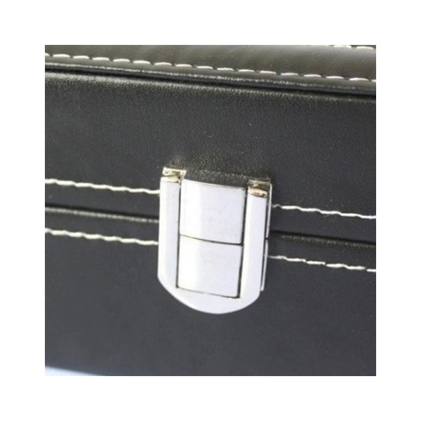 Kutija za satove Standard 6 spolja je obložena crnom eko kožom proštepanom belim koncem. Kutija se zatvara odnosno otvara sa prednje strane uz pomoć metalne kopče srebrne boje. Sa gornje strane kutija ima prozor” od stakla koji Vam omogućava da uživate u pogledu na Vaše omiljene modne dodatke. Unutrašnjost kutije za satove obložena je svetlim i mekim materijalom koji će sprečiti nastanak ogrebotina na satovima. U kutiji se nalazi ukupno 6 jastučića za ručne satove koji se po potrebi mogu vaditi.
