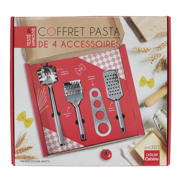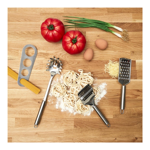Dodatni opis: Sa ovim setom za pripremu paste svako može bitii kralj ili kraljica testenine. Set sadrži 4 osnovna pribora za pravljenje paste u ličnom aranžmanu. Tu su roler za domaću testeninu posebno rende za rendanje sira zatim merice za optimalnu količinu testa po osobi i kašika za pastu sve u lepoj kutiji. Dakle nema više izgovora da usavršite svoje karbonare ili bolonjeze.