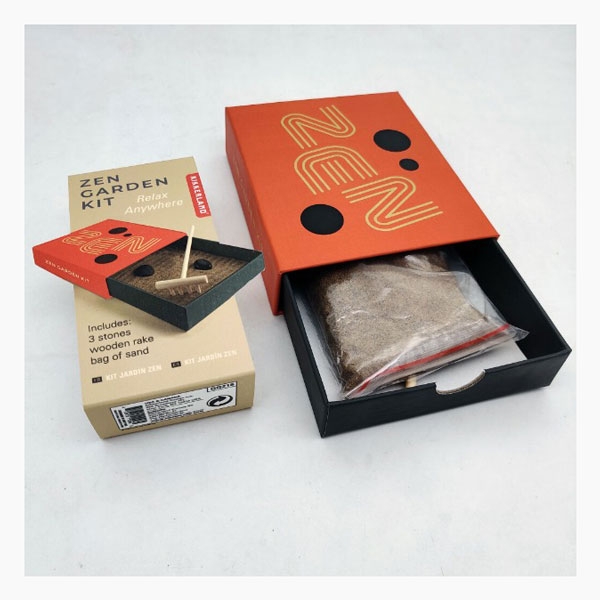 Dodatni opis: Tradicija uredjenja japanskih vrtova simbolizuje nešto što vekovima odoleva prolaznosti života. Zen majstori vekovima prave minimalističke bašte koje služe za meditaciju i umirivanje. Kikkerland predstavlja mali minimalistički zen vrt koji ima za cilj da Vas izmesti iz svakodnevnih životnih problema. Pored toga što je Zen bašta i lep ukrasni detalj u svakom domu ima i bitnu ulogu u opuštanju i relaksaciji. Preporučuje se da provedete svakodnevno oko petnaest minuta dnevno u svojoj zen bašti u koju možete da dodate i nekoliko kapi omiljenog eteričnog ulja. Zen vrtovi su idealni pokloni za sve ljude koji žive brzim tempom današnjice.