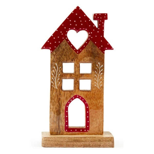 Dodatni opis: Dekorativna drvena kućica izrađena od punog drveta sa glaziranim crvenim krovom ukrašenim belim tufnicama. Savršena je da krasi prozor policu ili komodu tokom svih zimskih meseci. Moćna i ljupka u isto vreme prirodna tekstura drveta i crvena boja radosti – govore da zimskih praznici mogu da počnu.