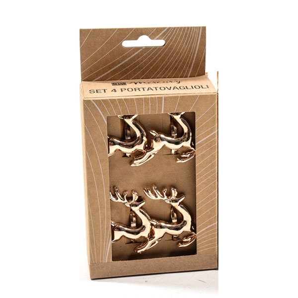 Dodatni opis: Set od 4 prstena za salvete u zlatnoj boji kao sjajan dodatak prazničnoj trpezi. Dostupni u 2 motiva – irvasi i jelkice. Italijanski dizajn pakovani su u dekorativnu natron poklon kutiju. Odličan poklon mladencima domaćinima slave ili kao pažljiv znak zahvalnosti prilikom kućne posete.