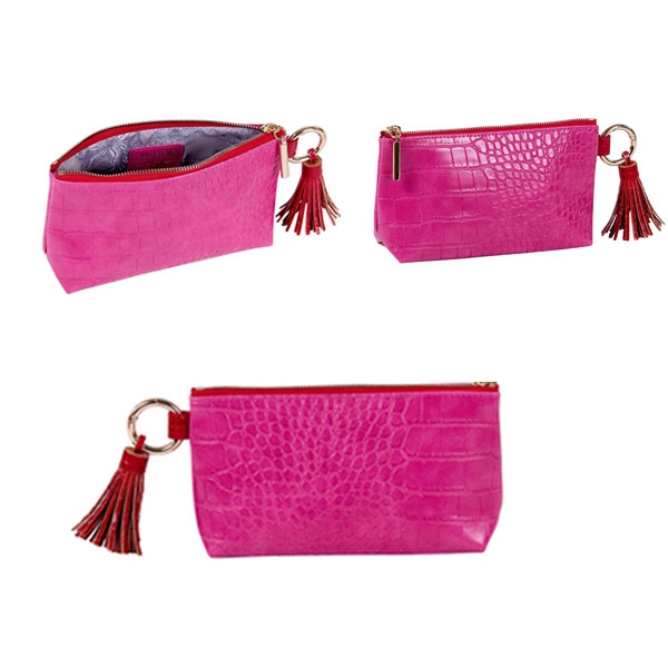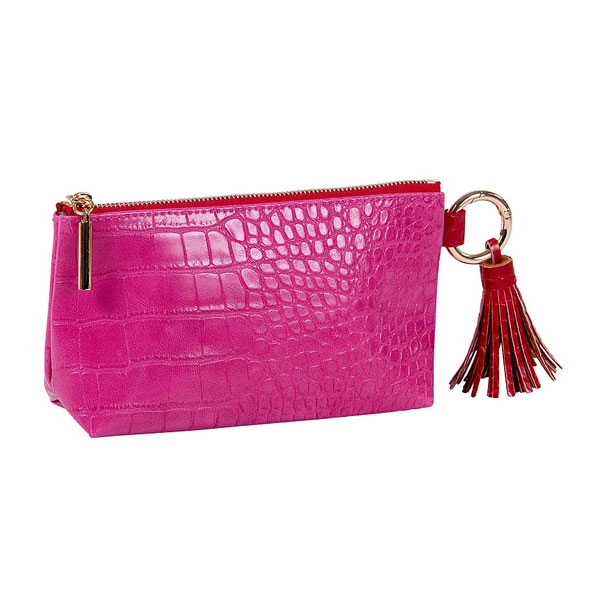 Dodatni opis: Jarko ružičasta i sofisticirani izgled krokodilske kože daju ovom favoritu bezvremensku eleganciju. Idealna veličina vam omogućava da bezbedno i na dohvat ruke čuvate sve svoje kozmetičke proizvode. Napravljena od veganskog materijala nalik koži torba za šminku nije samo modni dodatak već izraz ekološki osvešćenog stila. Pored prostrane unutrašnjosti torba za šminku ima i čvrstu ušivenu osnovu. To znači da torba uvek zadržava svoj oblik i nudi sigurno postolje bez obzira gde je postavite. Kontrastni patentni zatvarač i crvena resica sa strane zaokružuju ovaj omiljeni komad i daju torbi za šminkanje razigrani dodir. 100 ručni rad - posebno visok kvalitet izrade sa oslikanom postavom u stilu Toile-de-Joui.