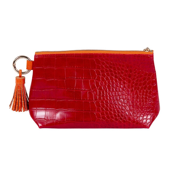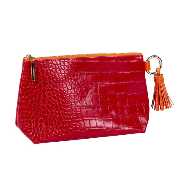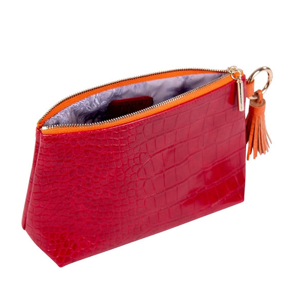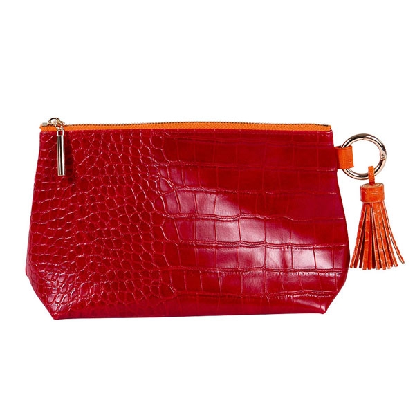 Dodatni opis: Duboko crvena boja MAJOIE kozmetičke torbe u kombinaciji sa sofisticiranim izgledom krokodilske kože daje ovom favoritu bezvremensku eleganciju. Veličina vam omogućava da bezbedno skladištite sve svoje kozmetičke proizvode i da ih držite na jednom mestu. Napravljena od veganskog materijala nalik koži torba nije samo modni dodatak već izraz ekološkog stila. Ova kozmetička torba ima čvrstu ušivenu osnovu. To znači da torba uvek zadržava svoj oblik i bezbedno stoji gde god da je postavite. Narandžasta resica sa strane zaokružuje ovaj omiljeni komad i daje torbi za šminkanje razigrani dodir. 100 ručni rad - posebno visok kvalitet izrade dokk je postava oslikana u stilu Toile-de-Joui.