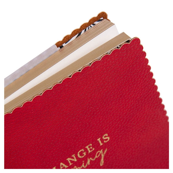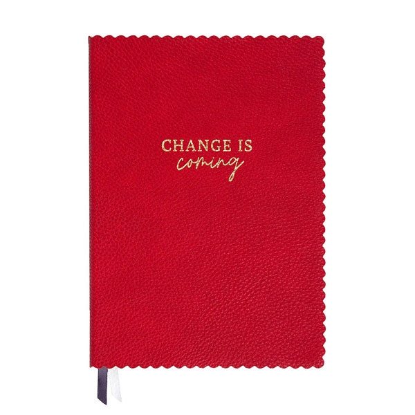 Dodatni opis: Jarkocrvena veganska navlaka sa izgledom kože zrači bezvremenskom elegancijom. Zlatno slovo „Promena dolazi“ nije samo lep detalj već i inspiriše nove ideje i planove koje možete da zabeležite na visokokvalitetnim belim stranicama unutra. Dva markera na trakama vam pomažu da organizujete svoje ideje i pronađete najnovije misli. Stranice velike gramaže ne samo da nude obilje prostora već i fleksibilne opcije dizajna zahvaljujući mreži sa tačkama. Još jedan praktičan detalj je džep na zadnjoj korici u koji možete da odložite beleške ili mala ljubavna pisma.