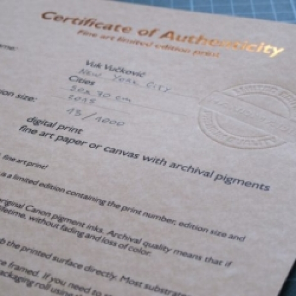 Materijal: Svi printovi izvedeni su na Canon i Hahnemühle papirima i platnima u ograničenom tiražu. Reč je o materijalima koji su namenjeni za izradu umetničkih reprodukcija vrhunskog kvaliteta. U kombinaciji sa upotrebom originalnih Canon LUCIA PRO pigmentnim mastilima dobija se dugovečan print koji neće bledeti niti menjati boju. Uz svaki print se dobija i sertifikat autentičnosti kao garancija originalnosti i kvaliteta.